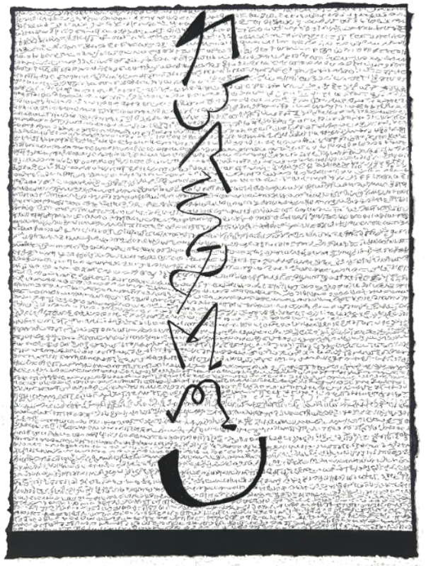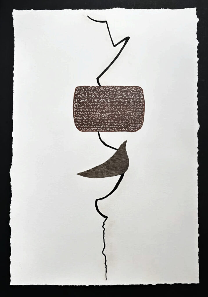 “Scribe” © Sukanya Rahman 2019 mixed media on paper 23″ X 16″
