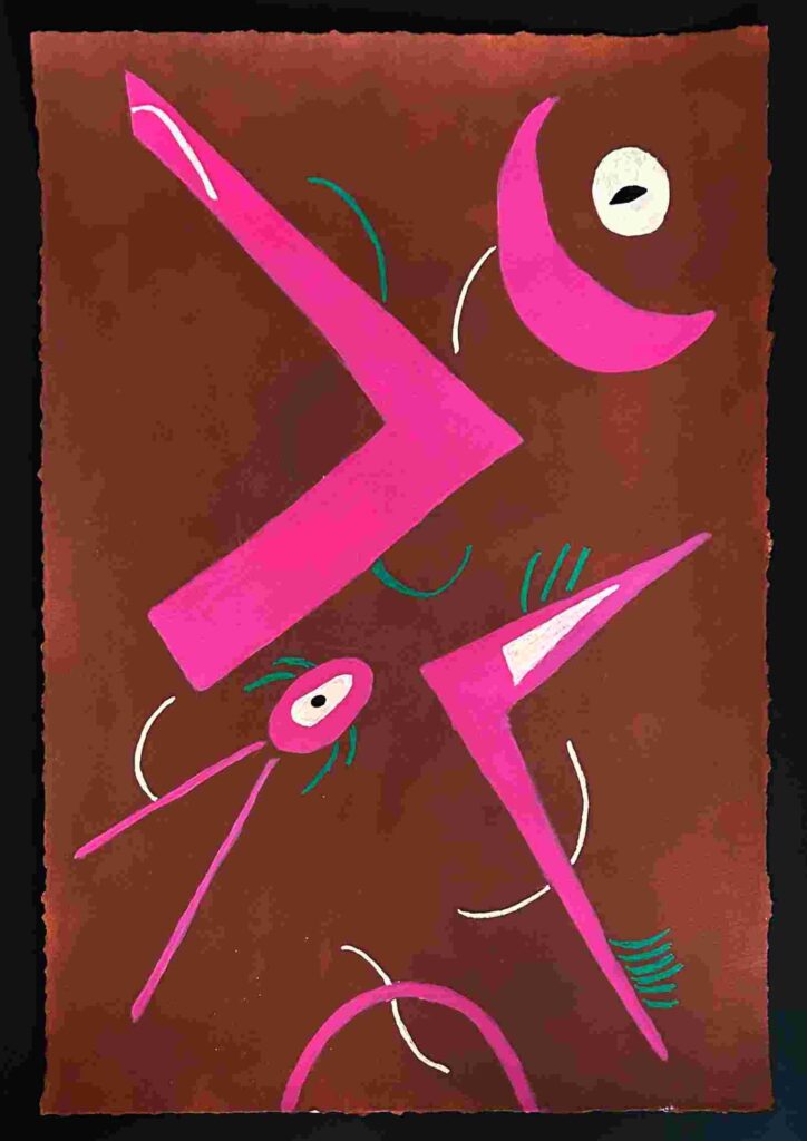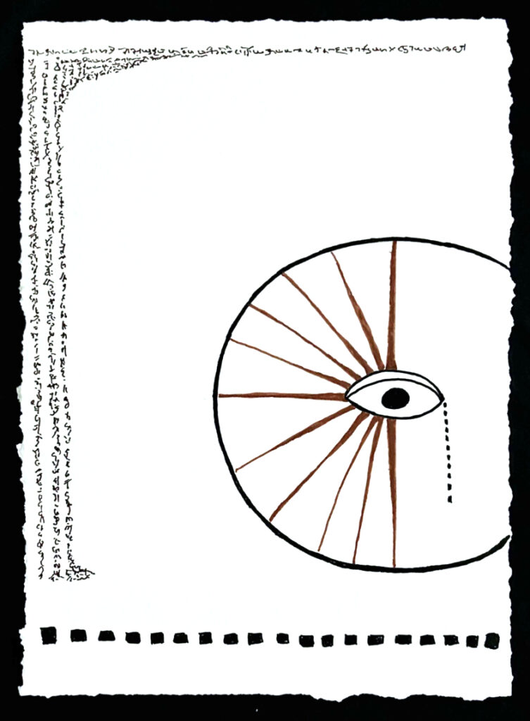 “Eye Movement #44 Sukanya Rahman © 2024, ink, acrylic and oil pastel on paper, 23″ X 16”